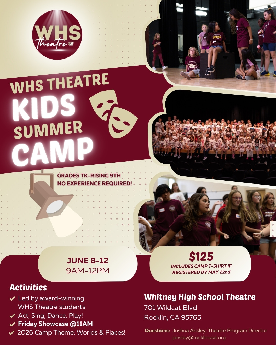| DESC: | Join us for an unforgettable week of acting, singing, dancing and playing! Groups are directed and run by advanced theatre students who will also serve as 26-27 Student Directors. - TK - Rising 9th Grade welcome! Register by the following the link: https://whitneytheatre.ludus.com/index.php?show_id=200524929 |